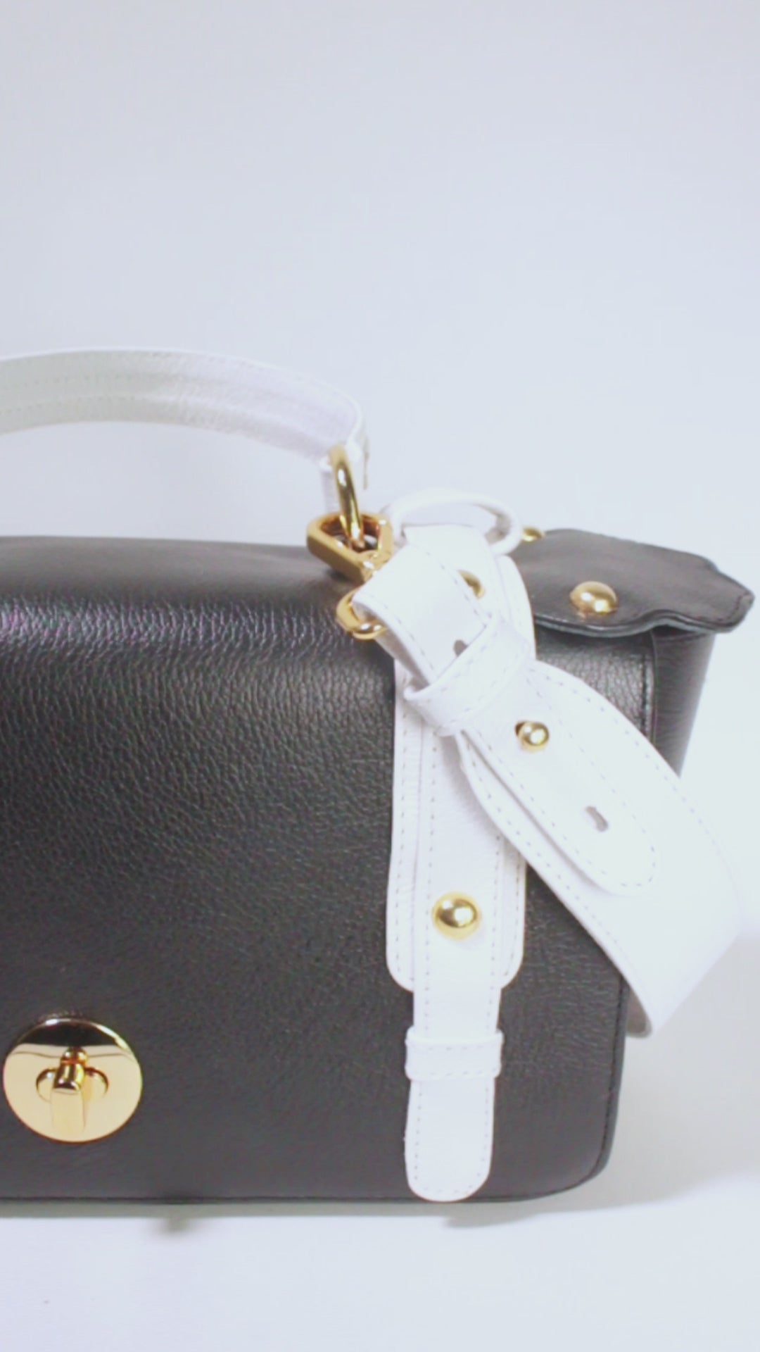 A bolsa Megan com ferragens banhadas no verniz italiano tem um espaço interno excelente, com bolso em zíper e o porta chaves Miss Purse, presente em todas as nossas bolsas. A combinação de preto e branco é sempre elegante e sofisticada, as ferragens dão um toque de refinamento à peça e são resistentes à corrosão e ao desgaste.