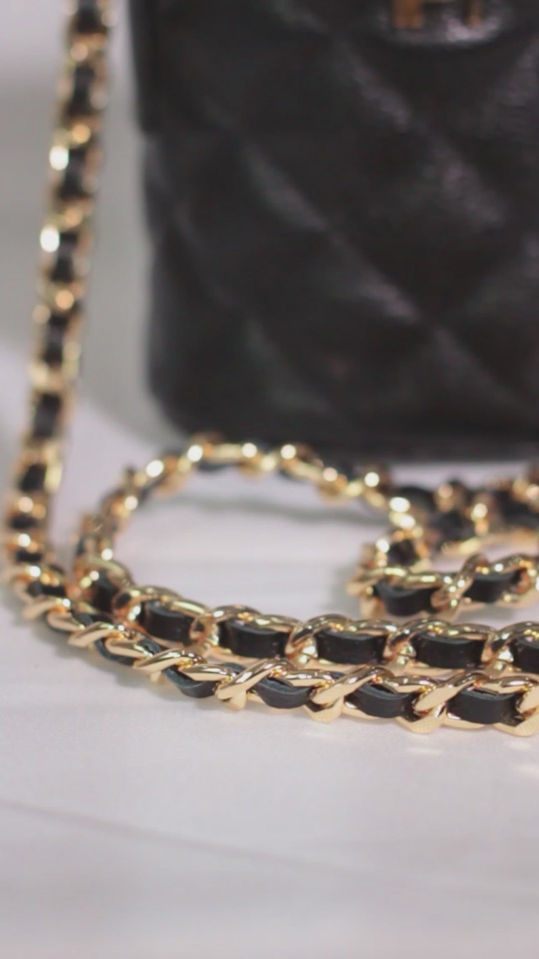 A bolsa também possui uma alça de corrente fixa, que permite usá-la como crossbody, lateral ou transversal.